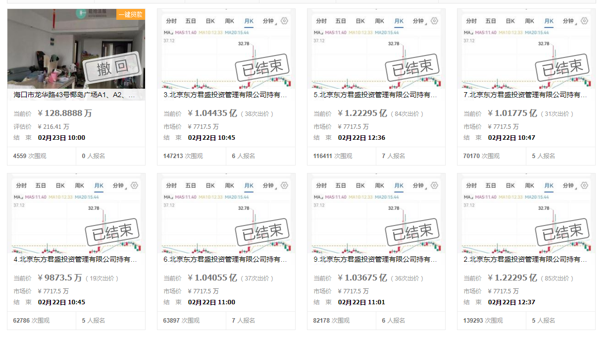 今日(2月22日),海南椰岛大股东北京东方君盛投资管理有限公司(以下简称东方君盛)所持公司6000万股股份在淘宝司法拍卖平台上公开拍卖,此轮拍卖共分为8场,每场750万股。截至目前,此轮拍卖已全部成交。