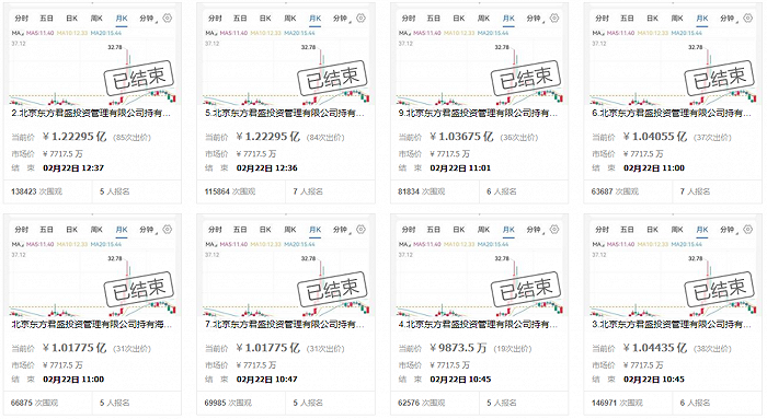 东方君盛持有的6000万股海南椰岛股份被分为八个标的拍卖,每个标的750万股。拍卖从2月22日早9:30左右开始,持续至12:30左右结束,累计获得超70万人次围观。