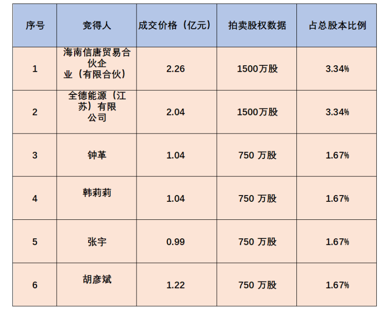 今年2月底,海南椰岛控股股东东方君盛持有的6000万股股份于在淘宝司法拍卖网络平台进行公开拍卖,拍卖股份分别由海南信唐贸易合伙企业(有限合伙,以下简称:海南信唐)、全德能源(江苏)有限公司、钟革、韩莉莉、张宇、胡彦斌这六家竞得,其竞得的股权占总股本的3.34%、3.34%、1.67%、1.67%、1.67%和1.67%。