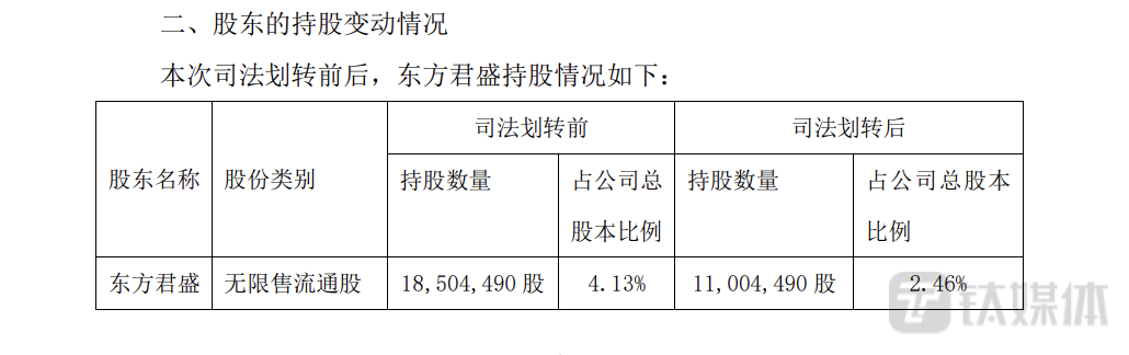 5月7日晚间,海南椰岛(600238.SH)发布公告,宣布北京东方君盛投资管理有限公司(东方君盛)所持有的750万股公司股份被司法划转,划转的股份占海南椰岛公司总股本的1.67%。此次司法划转后,东方君盛的持股比例降由4.13%至2.46%。
