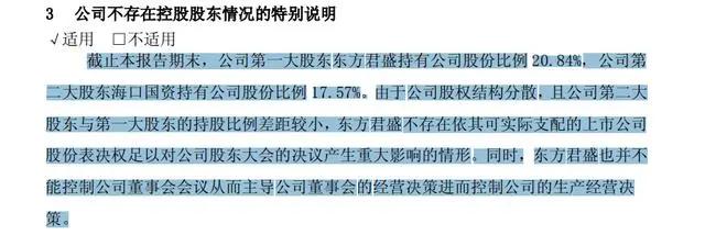 然而,海南椰岛并未承认东方君盛在公司中的控股地位。公司连续4年(2015年-2018年)在年报中表示,由于公司股权结构分散,且公司第二大股东与第一大股东的持股比例差距较小,东方君盛不存在依其可实际支配的上市公司股份表决权。因此在这4年期间海南椰岛一直处于无实控人的状态。