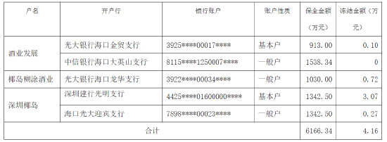 海南椰岛(集团)股份有限公司于6月6日晚间发布公告称,公司于近日通过银行信息推送以及案件信息自查等方式发现全资子公司海南椰岛酒业发展有限公司(以下简称“酒业发展”)、深圳椰岛销售有限公司(以下简称“深圳椰岛”)及控股子公司贵州省仁怀市椰岛糊涂酒业股份有限公司(以下简称“椰岛糊涂酒业”)部分银行账户被冻结的情形。