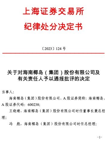 对海南椰岛(集团)股份有限公司及时任董事长兼总经理王晓晴、时任总经理冯彪、时任财务总监符惠玲予以通报批评。