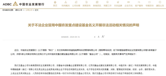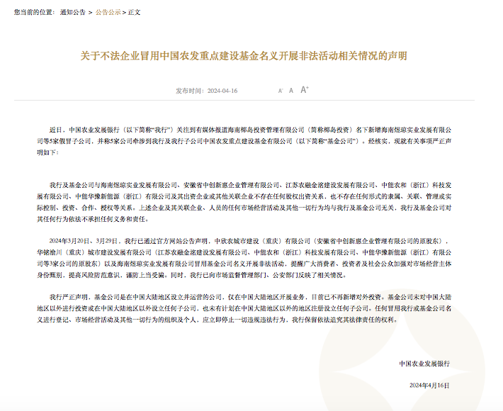 值得关注的是,在上述公司变更股权前不久,农发行已对浙江华豫、安徽中创、浙江农和进行了打假。2024年3月20日,农发行在官网发布了打假公告,明确指出这些公司的股东,如重庆华铭、安徽中欣以及海南煜琼,均为冒用农发重点建设基金名义的企业。