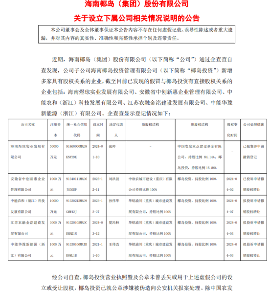 4月12日,海南椰岛公司公开声明,除了中国农发重点建设基金有限公司,其与椰岛投资与另外五家公司及其原股东之间并无任何股权或业务往来。这些公司及与其相关的企业和个人在市场上的一切活动,都与海南椰岛及椰岛投资无关,公司对此不承担任何责任。椰岛投资已就公章涉嫌被伪造向公安机关报案处理,表明这五家公司并非其真正持股,而是假冒与上市公司关联的企业。