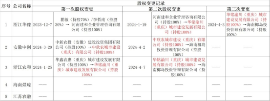 浙江华豫于2024年1月将股东变更为重庆华铭全资持股,随后在同年4月,又变更为椰岛投资全资持股;安徽中创在2021年4月7日,将原本由安徽中欣全资持股的状态变更为椰岛投资全资持股;而浙江农和则在2024年4月将重庆华铭的100%持股转变为椰岛投资全资持股。