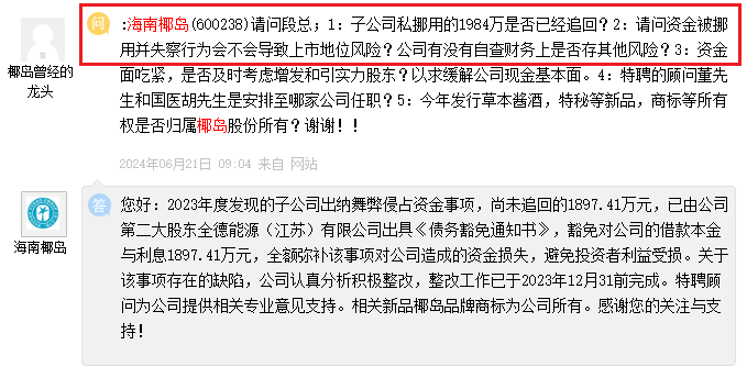 6月21日,有投资者在“上证e互动”网站一连向海南椰岛提出5个问题。