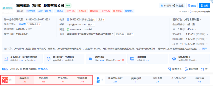 另据信息显示,海南椰岛自身风险200多项,周边风险达到400多项,预警提醒有300多项。