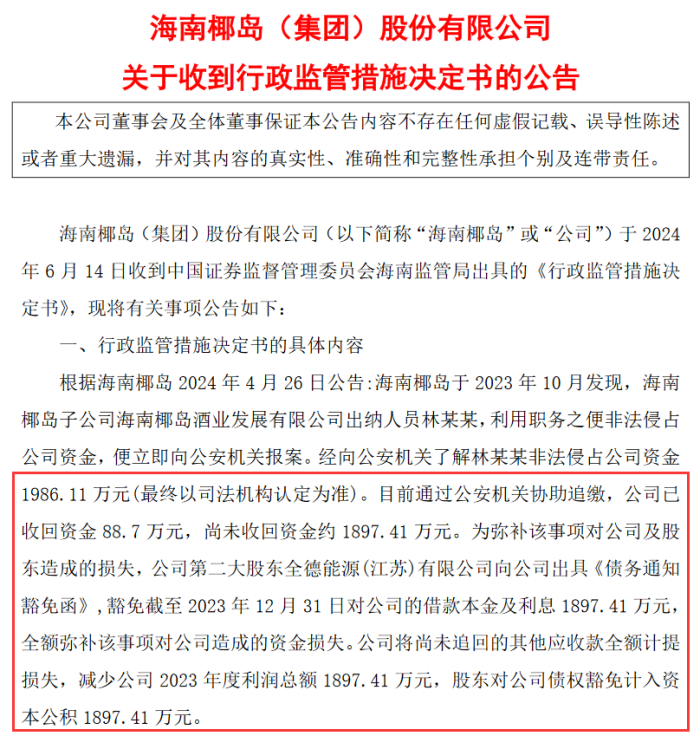 事情的原委是,海南椰岛在2023年10月发现有员工非法侵占公司1986万巨款,但是,直到2024年4月26日,公司才发布公告,信息披露不及时。