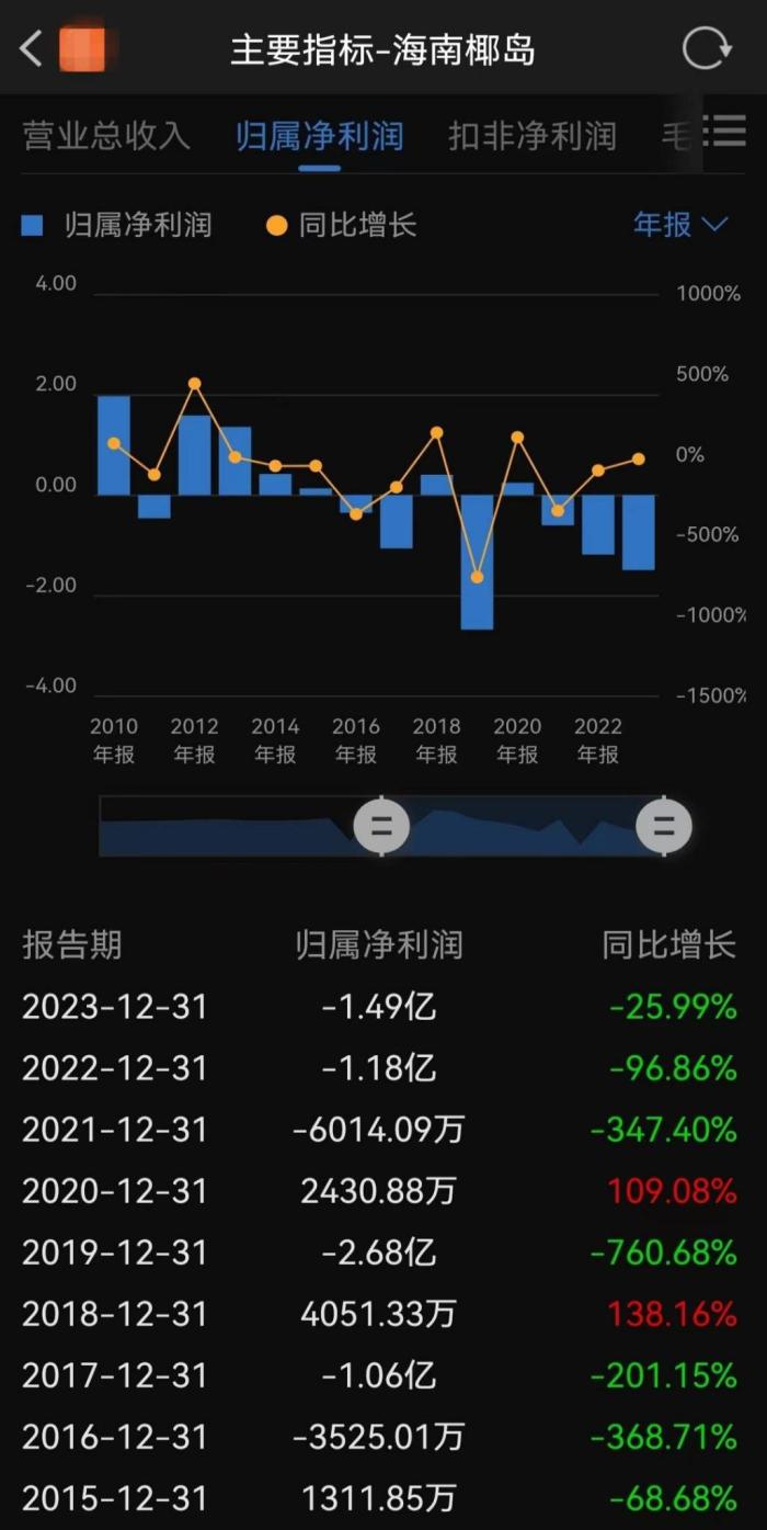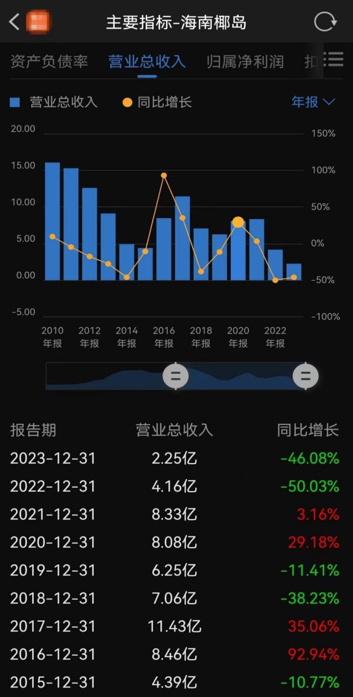 在上下起伏中,海南椰岛营收逐渐从2010年巅峰时的16亿元跌至2023年的2亿多元,净利润则从2010年的近2亿元变成2023年的亏损1亿多元。