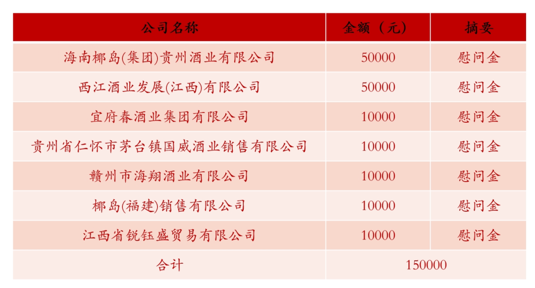 在此海南椰岛诚挚的感谢海南椰岛(集团)贵州酒业有限公司、西江酒业发展(江西)有限公司、宜府春酒业集团有限公司、贵州省仁怀市茅台镇国威酒业销售有限公司、赣州市海翔酒业有限公司、椰岛(福建)销售有限公司和江西省锐钰盛贸易有限公司的暖心慰问金。让我们携手和衷共济、共克时艰。