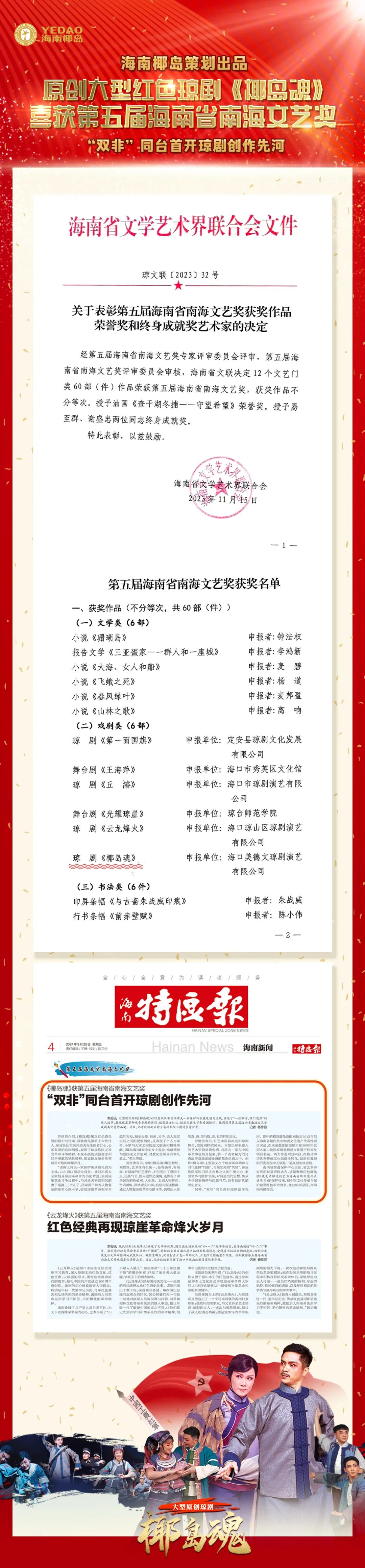 近期,第五届海南省南海文艺奖揭晓,由海南椰岛集团策划出品的原创大型红色琼剧《椰岛魂》喜获戏剧类优秀作品奖。南海文艺奖是经省委、省政府同意设立的全省文学艺术界综合性文艺奖项,是海南省文学艺术领域规格最高的奖项。
