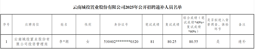 根据《云南城投置业股份有限公司2025年公开招聘公告》,经初面、笔试、复试、背景调查、体检等程序,现将本次云南城投置业股份有限公司2025年公开招聘拟录用人员名单(见附件)予以公示。