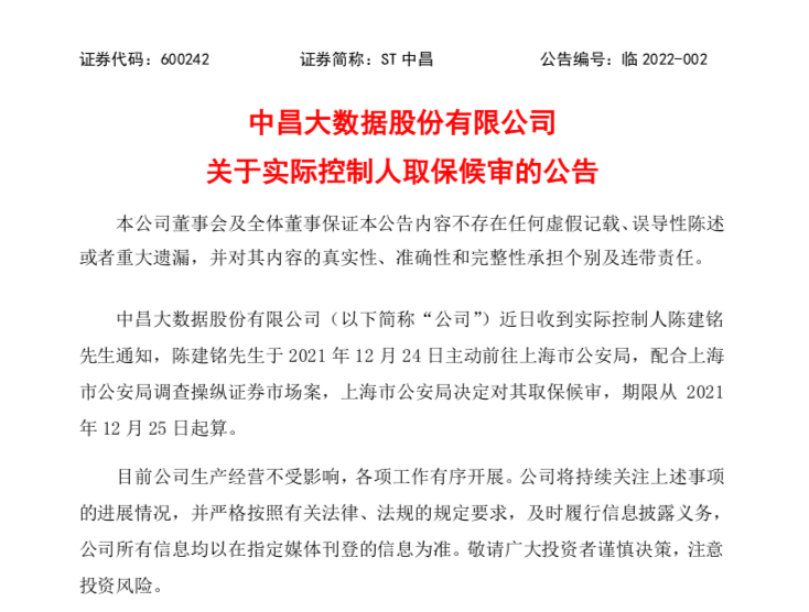 ST中昌1月7日晚公告称,公司实际控制人陈建铭于2021年12月24日主动前往上海市公安局,配合上海市公安局调查操纵证券市场案,上海市公安局决定对其取保候审,期限从2021年12月25日起算。ST中昌称,目前公司生产经营不受影响,各项工作有序开展。