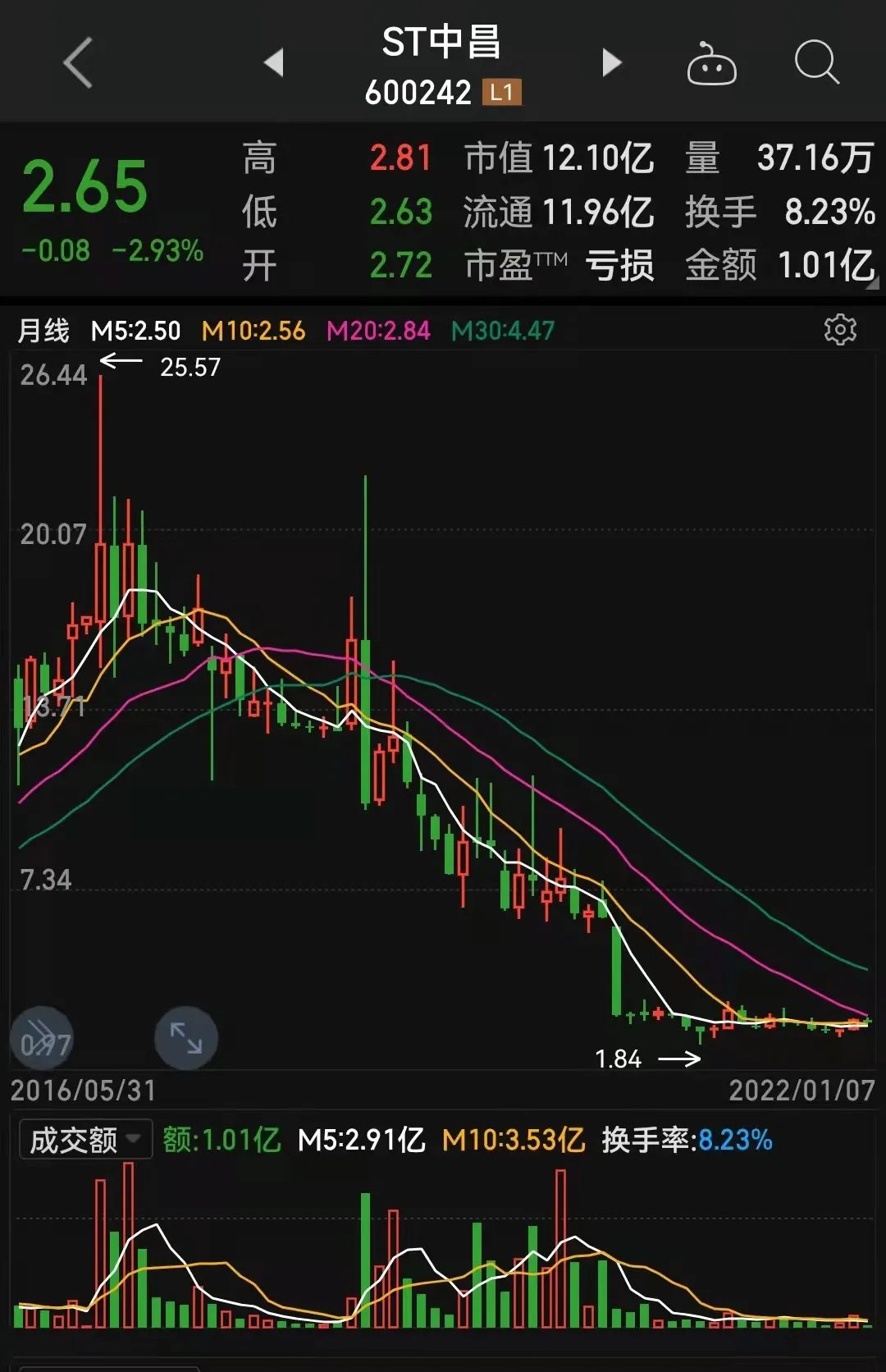 Wind数据显示,截至2022年1月7日收盘,ST中昌报2.65元/股,较2017年3月股价高点25.57元/股缩水约九成,总市值蒸发105亿元至12.1亿元。