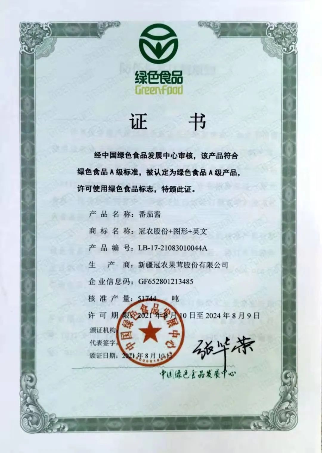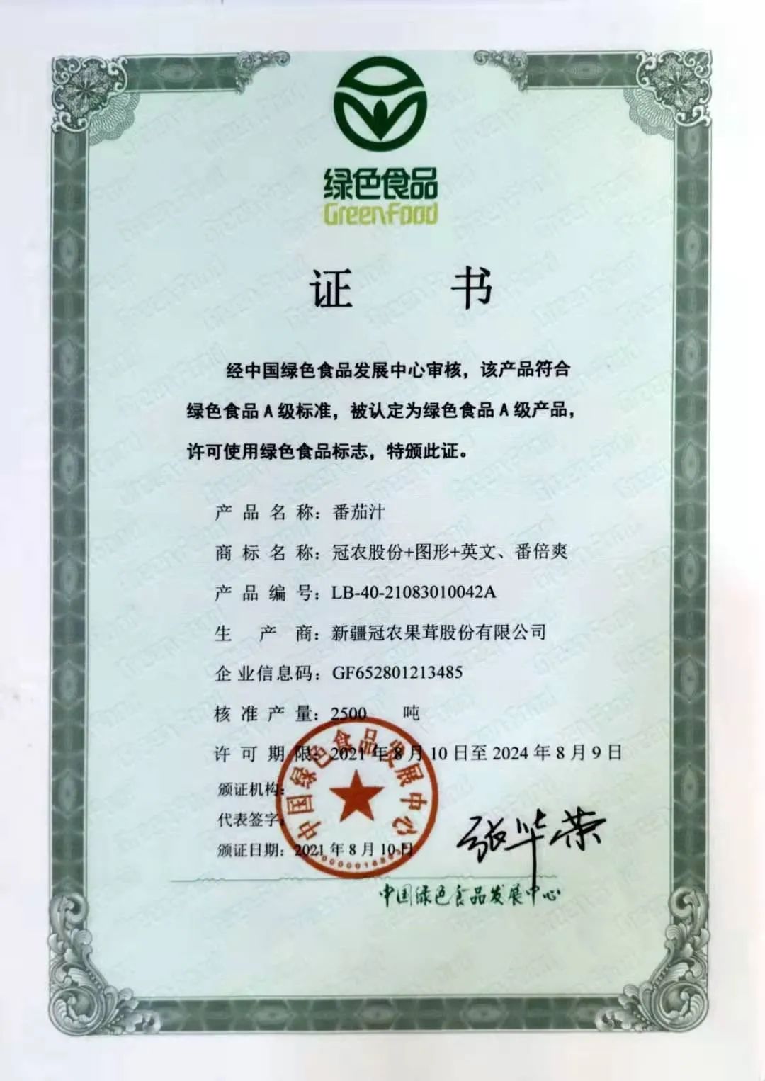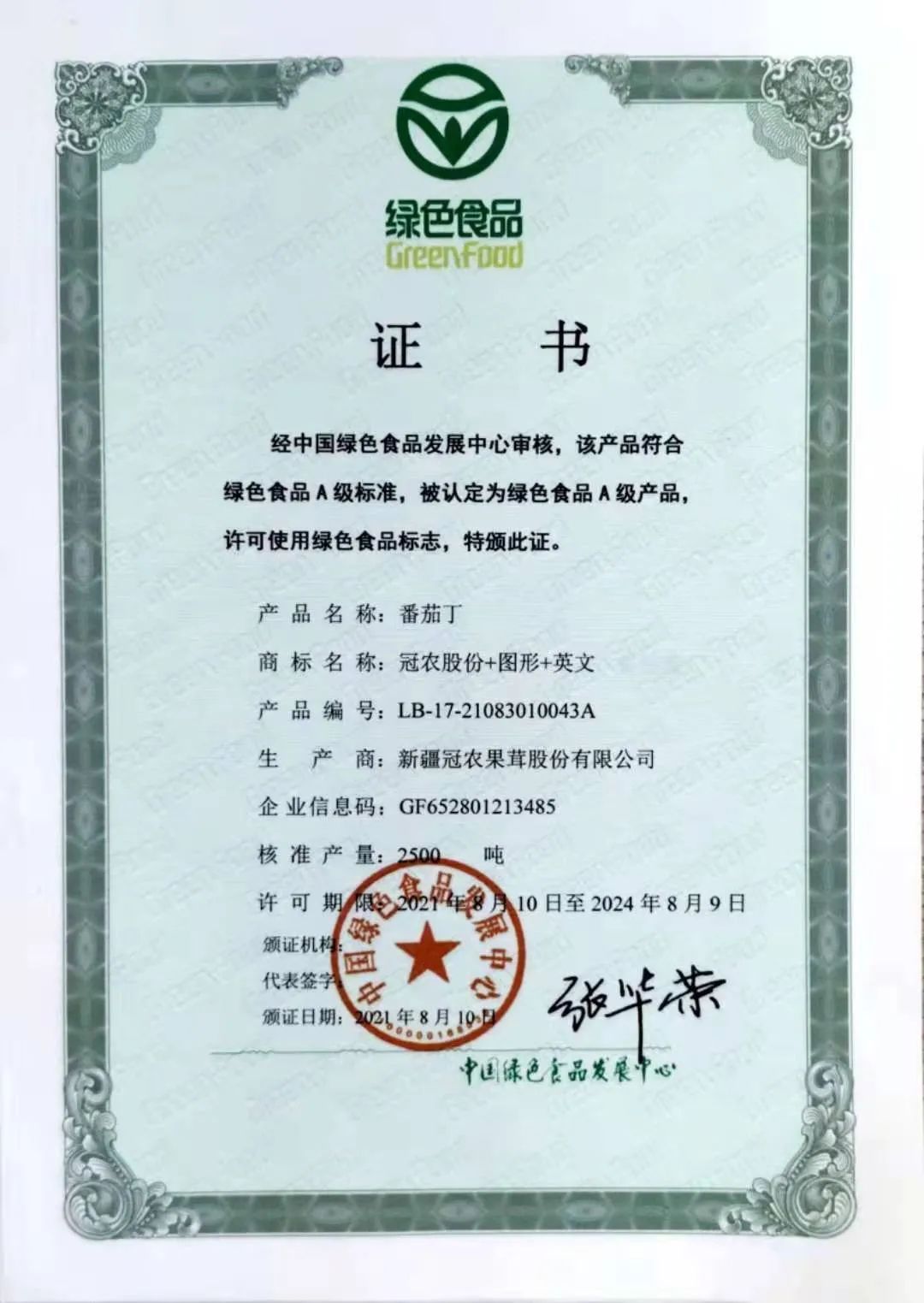 冠农股份公司作为国有上市企业,历年来高度重视绿色低碳发展,积极打造绿色制造先进典型,今年,冠农番茄公司番茄酱、番茄丁、番茄汁产品分别荣获国家绿色食品认证,公司将珍惜荣誉、砥砺奋进,持续走好清洁绿色的高质量发展之路。