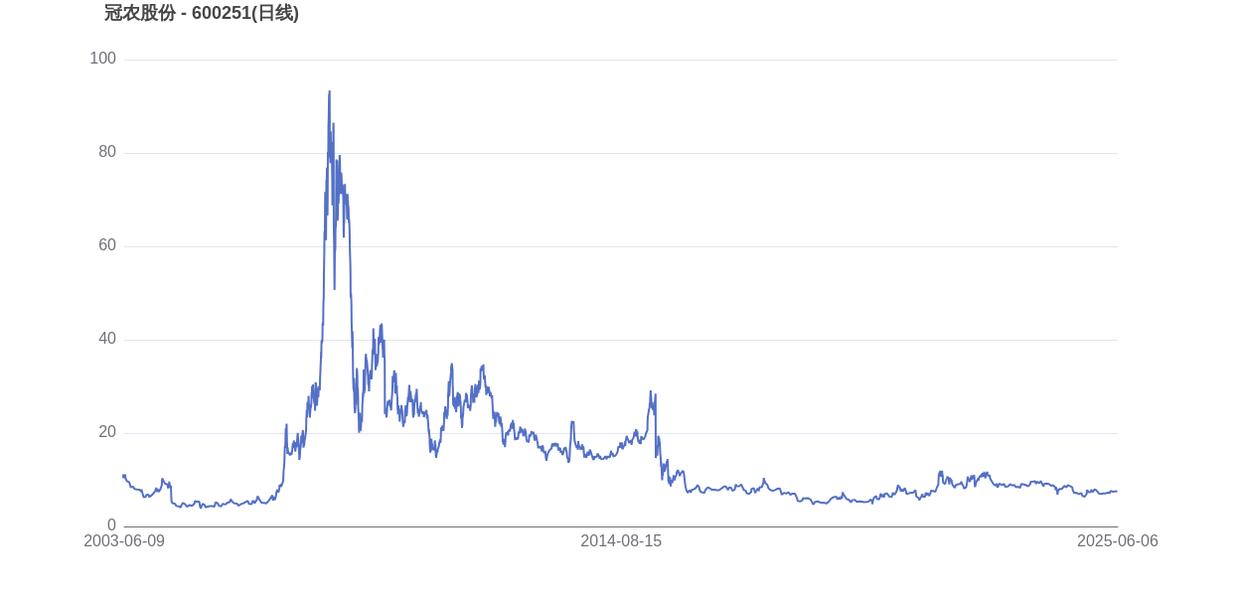 从上市首日至今,冠农股份的市值实现了3.51倍的增长,显示出一定的成长性。2008年5月16日,冠农股份的市值巅峰达到195.62亿元,股价也顺应升至83.6元。而至6月6日收盘,冠农股份的股价为7.5元,市值为58.27亿元,相比峰值时期市值减少137.35亿元,市值蒸发了70.21%。