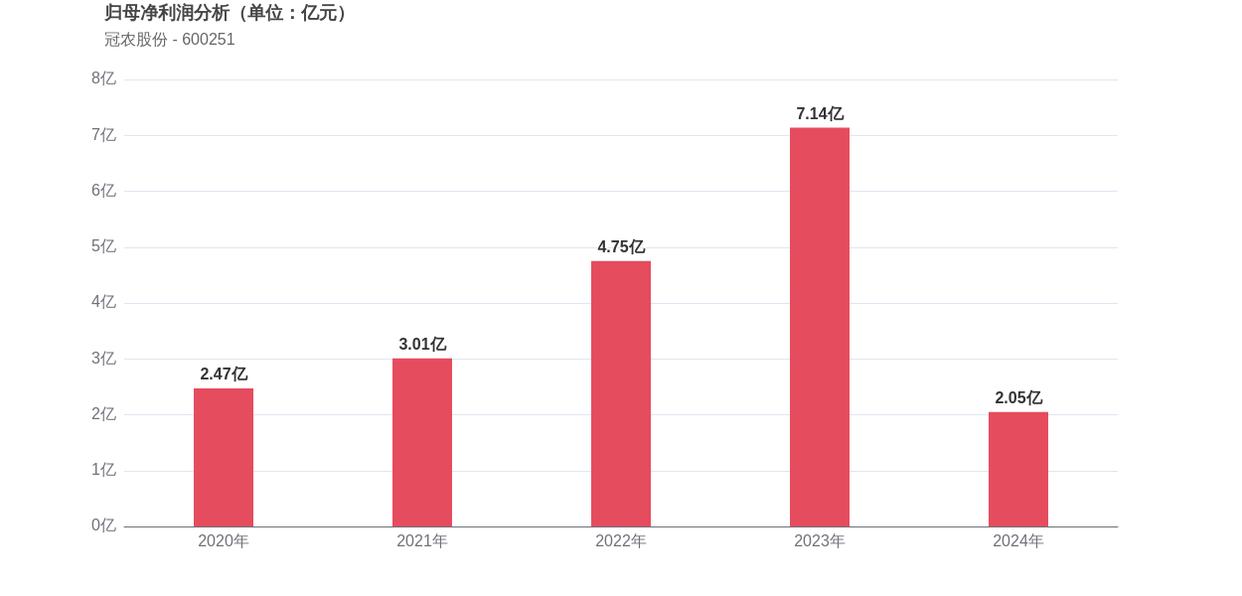 利润角度分析,2020年冠农股份实现归母净利润2.47亿元,2024年2.05亿元。虽然2020年至2023年连续四年保持增长态势,但2024年归母净利润同比下降71.58%,盈利水平出现明显回落。