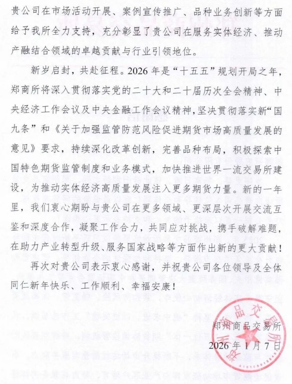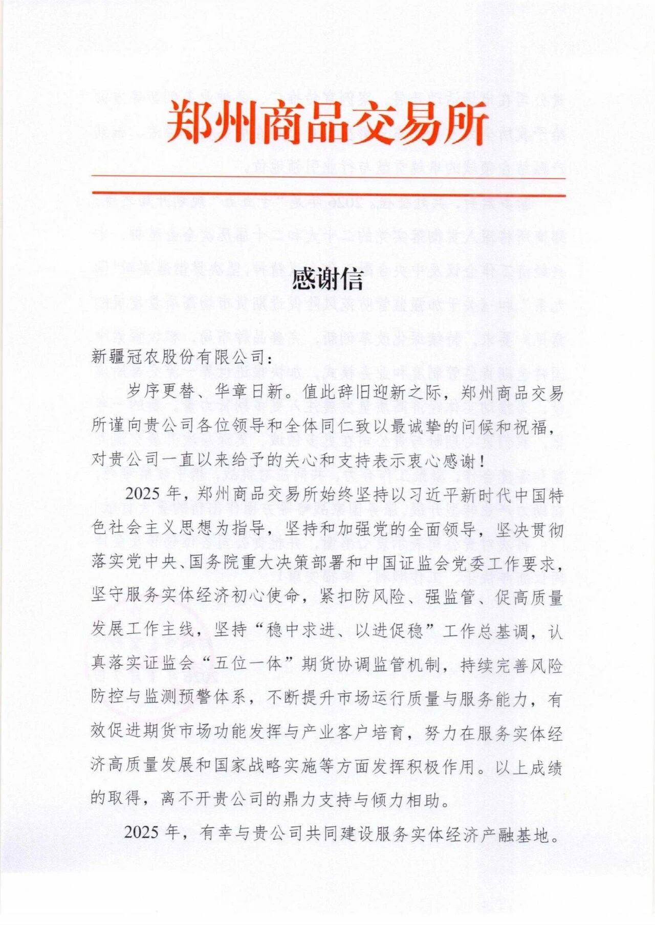 近日,新疆冠农股份有限公司(以下简称“冠农股份”)收到郑州商品交易所(以下简称“郑商所”)发来的感谢信。信中,郑商所对冠农股份过去一年在服务实体经济、推动产融基地建设、发挥期货市场功能、培育产业客户等方面所作的贡献给予高度评价,并向公司致以诚挚的新年问候与祝福。