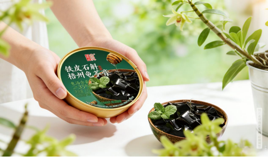 “双钱”牌2026年新品铁皮石斛梧州龟苓膏,在龟和甘草、茯苓、金银花、蒲公英、槐花、栀子、白芷、罗汉果的经典配方上优化迭代,核心新添霍山铁皮石斛、玉竹、麦冬三味温润甘甜食材,为滋润加分。