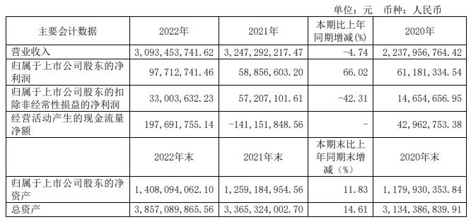 鑫科材料2022年年度报告显示,2022年,鑫科材料实现营业收入30.93亿元,同比下滑4.74%;归属于上市公司股东的净利润9771.27万元,同比增长66.02%;归属于上市公司股东的扣除非经常性损益的净利润3300.36万元,同比下滑42.31%;经营活动产生的现金流量净额1.98亿元。