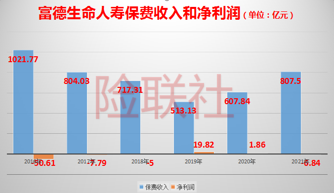 回顾过往,富德生命人寿的保费收入呈现出下滑趋势。2016年至2019年,富德生命人寿保费收入分别为1021.77亿元、804.03亿元、717.31亿元以及513.13亿元,直到2020年,富德生命人寿的保费收入增长18.5%至607.84亿元。