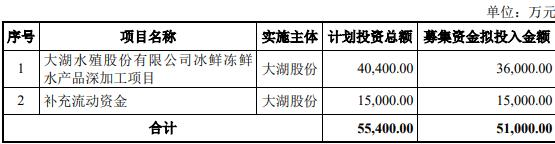 本次向特定对象发行股票募集资金总额(含发行费用)不超过51,000.00万元(含本数),扣除发行费用后的募集资金净额将用于大湖水殖股份有限公司冰鲜冻鲜水产品深加工项目、补充流动资金。