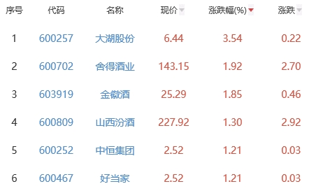 其中,大湖股份、舍得酒业、金徽酒、山西汾酒、中恒集团、好当家位列板块涨幅前五位,涨幅分别为3.54%、1.92%、1.85%、1.30%、1.21%、1.21%。