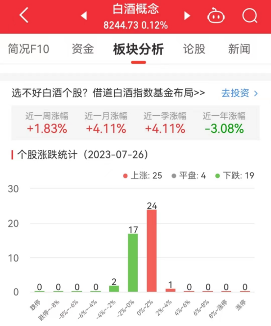 今日,白酒概念板块整体涨幅0.12%,其中25只股票上涨,4只股票平盘,19只股票下跌。
