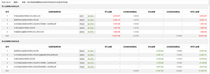 具体来看,中信证券上海分公司、国泰君安证券总部分别买入2574.27万元、2545.14万元;国泰君安证券总部、东方财富证券拉萨金融城南环路证券营业部分别卖出2575.64万元、2381.21万元。