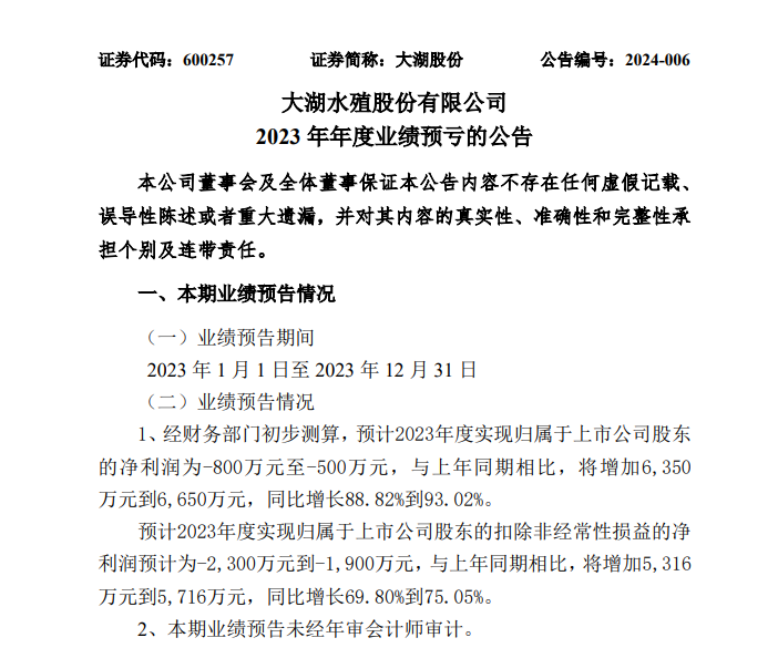 近日,大湖股份发布2023年年度业绩预亏公告。