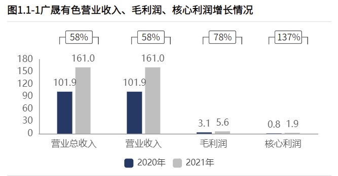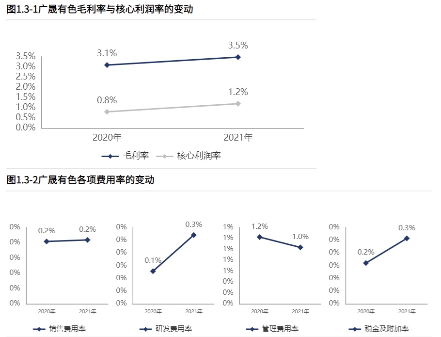 广晟有色2021年毛利率3.48%,与2020年相比,毛利率上升0.39个百分点,增幅12.56%,产品竞争力改善;核心利润率1.19%,与2020年相比,核心利润率上升0.40个百分点,增幅50.07%,经营活动盈利能力改善。核心利润率改善主要源于毛利率的提高。
