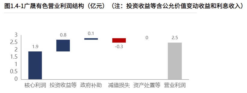 广晟有色2021年营业利润2.46亿元,经营活动产生的核心利润占主导地位。发生减值,对营业利润产生一定影响。此外,2021年发生营业外收入264.17万元,较去年有所增加。发生营业外支出0.47亿元,较去年有所增加。