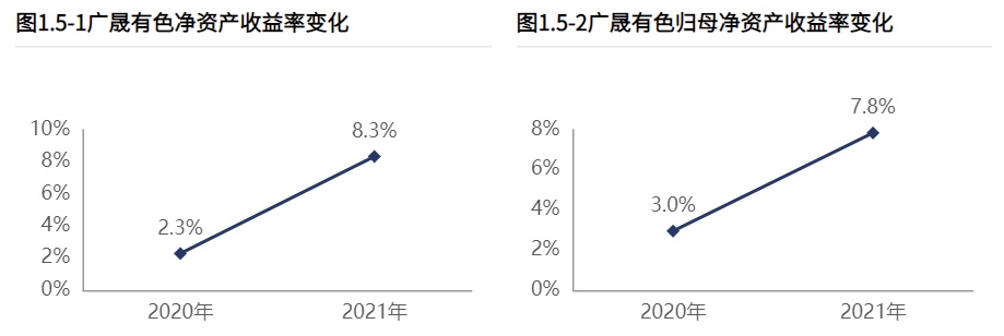 2021年广晟有色净资产收益率8.34%,相较于2020年股东回报水平提高;归母净资产收益率7.85%,相较于2020年对母公司股东回报水平提高。