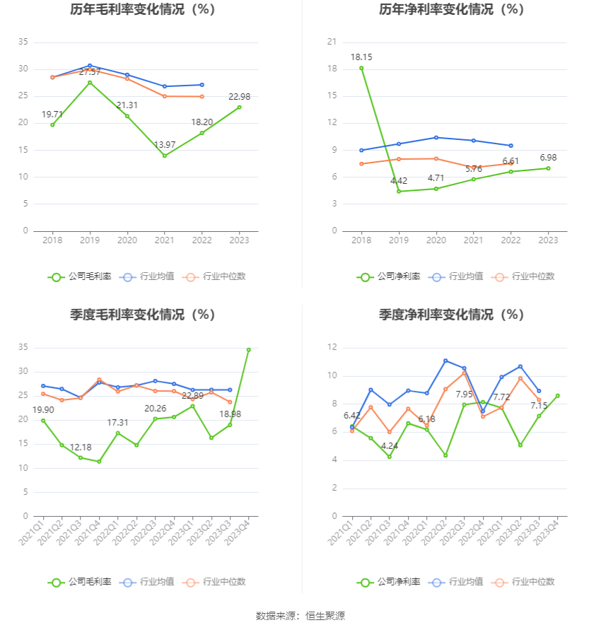 2023年,公司毛利率为22.98%,同比上升4.78个百分点;净利率为6.98%,较上年同期上升0.37个百分点。从单季度指标来看,2023年第四季度公司毛利率为34.59%,同比上升13.96个百分点,环比上升15.61个百分点;净利率为8.59%,较上年同期上升0.45个百分点,较上一季度上升1.44个百分点。
