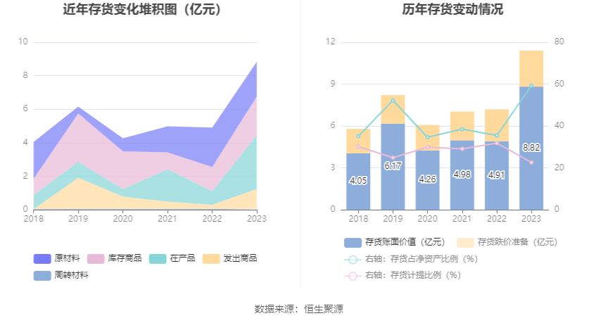 从存货变动来看,截至2023年年末,公司存货账面价值为8.82亿元,占净资产的59.26%,较上年末增加3.92亿元。其中,存货跌价准备为2.58亿元,计提比例为22.6%。