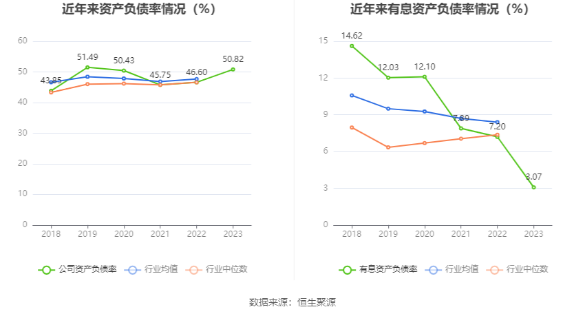 在偿债能力方面,公司2023年年末资产负债率为50.82%,相比上年末上升4.22个百分点;有息资产负债率为3.07%,相比上年末下降4.13个百分点。