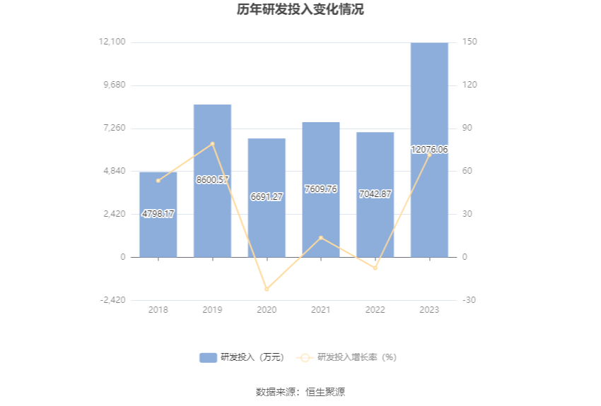 2023年全年,公司研发投入金额为1.21亿元,同比增长71.46%;研发投入占营业收入比例为5.02%,相比上年同期上升1.87个百分点。此外,公司全年研发投入资本化率为5.10%。