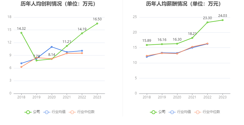 截至2023年末,公司员工总数为859人,人均创收279.79万元,人均创利16.50万元,人均薪酬24.03万元,较上年同期分别增长4.78%、16.24%、3.16%。
