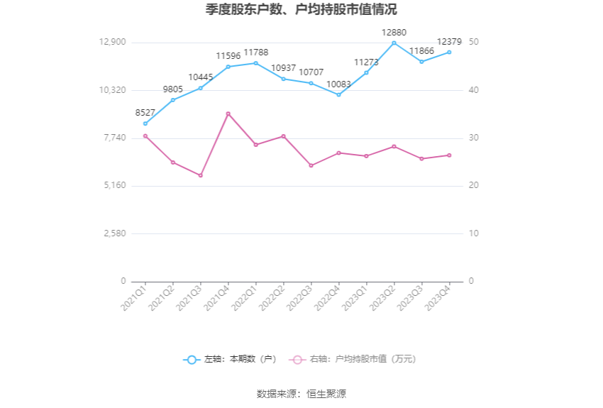 筹码集中度方面,截至2023年年末,公司股东总户数为1.24万户,较三季度末增长了513户,增幅4.32%;户均持股市值由三季度末的25.72万元上升至26.44万元,增幅为2.80%。