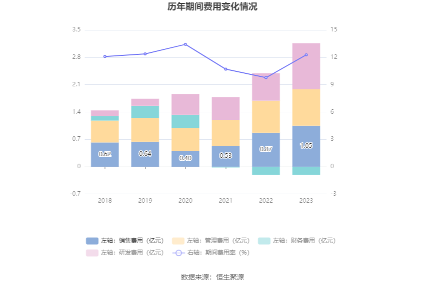 2023年,公司期间费用为2.95亿元,较上年同期增加7651.24万元;期间费用率为12.27%,较上年同期上升2.50个百分点。其中,销售费用同比增长20.58%,管理费用同比增长12.87%,研发费用同比增长67.34%,财务费用由去年同期的-2148.96万元变为-2090.14万元。