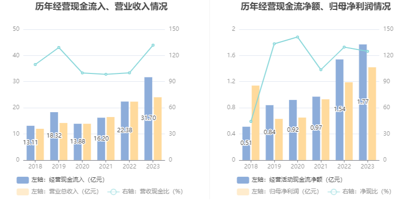 2023年,公司营业收入现金比为131.88%,净现比为124.79%。