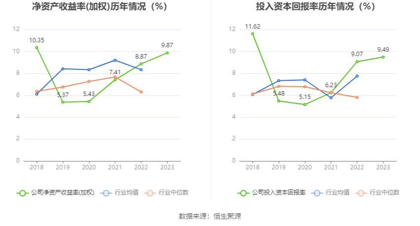 数据显示,2023年公司加权平均净资产收益率为9.87%,较上年同期增长1.00个百分点;公司2023年投入资本回报率为9.49%,较上年同期增长0.42个百分点。