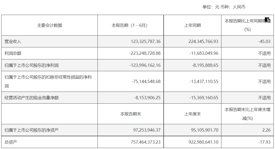 ST景谷今年上半年营业收入为1.23亿元,同比下降45.03%;归母净利润为-1.24亿元,扣非归母净利润为-7514.45万元。