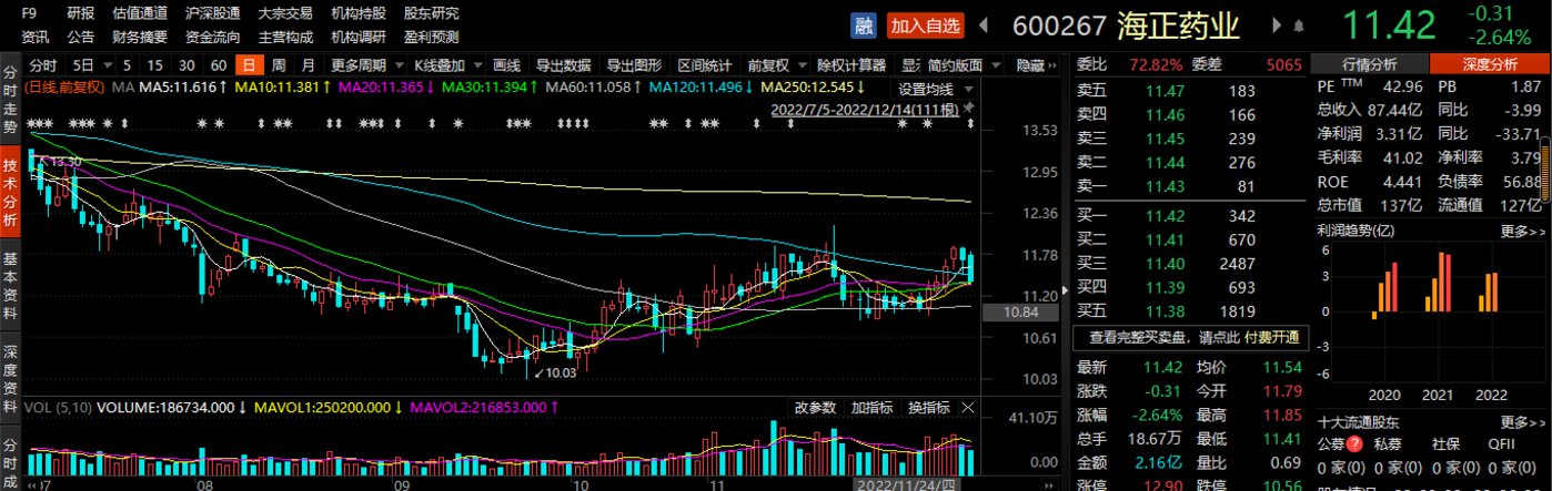 除此之外,海正药业的股东们也在轮番减持。12月7日,海正药业发布了大股东减持公告显示,自2022年6月7日至2022年12月6日期间,公司大股东HPPC通过集中竞价交易方式累计已减持公司股份2396万股,占公司目前总股本的2%,套现金额为2.9亿元。