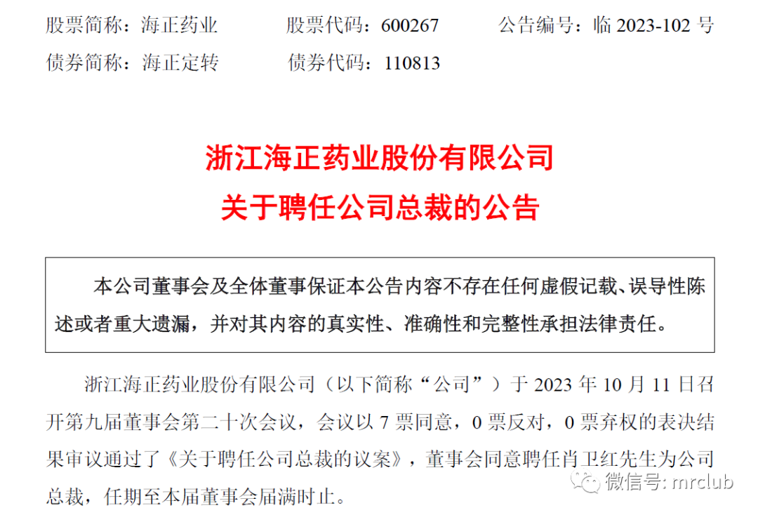 今日,海正药业于上交所发布《浙江海正药业股份有限公司关于聘任公司总裁的公告》,公告显示,浙江海正药业股份有限公司于 2023 年 10 月 11 日召开第九届董事会第二十次会议,董事会同意聘任肖卫红为公司总裁,任期至本届董事会届满时止。