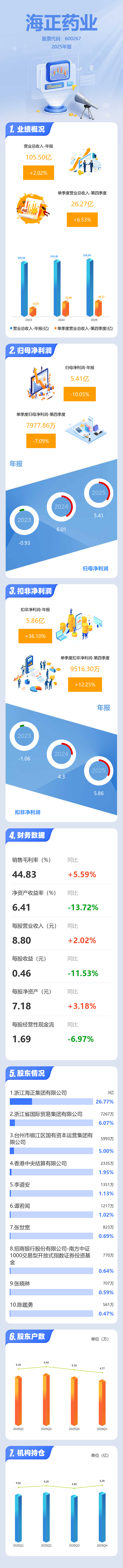 证券之星消息,海正药业2025年年报显示,当年度公司主营收入105.5亿元,同比上升2.02%;归母净利润5.41亿元,同比下降10.06%;扣非净利润5.86亿元,同比上升36.11%;其中2025年第四季度,公司单季度主营收入26.27亿元,同比上升6.54%;单季度归母净利润7977.86万元,同比下降7.09%;单季度扣非净利润9516.3万元,同比上升12.25%;负债率41.19%,投资收益-3669.78万元,财务费用8403.62万元,毛利率44.83%。