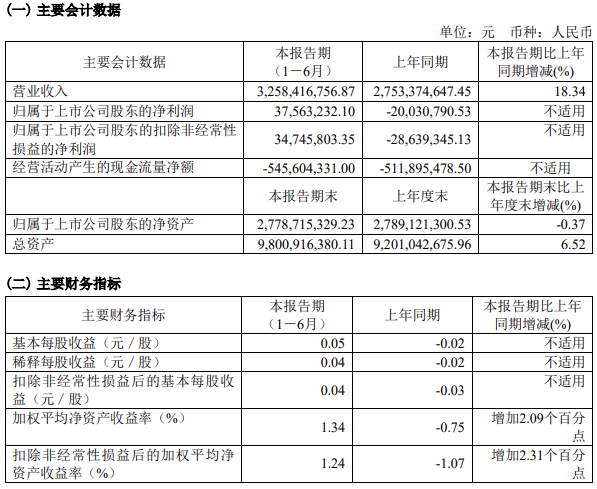 公司上半年实现订货 54.85 亿元,比上年同期增长 16.30%;回款 30.85 亿元,比上年同期增长 16.13%;营业收入 32.58 亿元,比上年同期增长 18.34%;利润总额 1.74 亿元,比上年同期增加 8,314.74 万元;净利润 1.40 亿元,比上年同期增加 7,201.28 万元;归属于母公司所有者的净利润 3,756.32 万元,比上年同期增加 5,759.40 万元;归属于母公司所有者的扣除非经常性损益的净利润 3,474.58 万元,比上年同期增加 6,338.51 万元。
