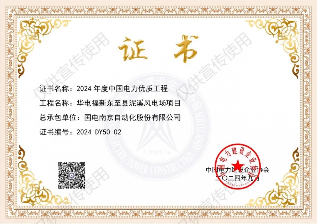 9月2日,中国电力建设企业协会在其官方网站发布《关于公布2024年度中国电力优质工程评审结果的通知》,公司承建的华电福新东至县泥溪风电场项目荣获2024年度中国电力优质工程奖。