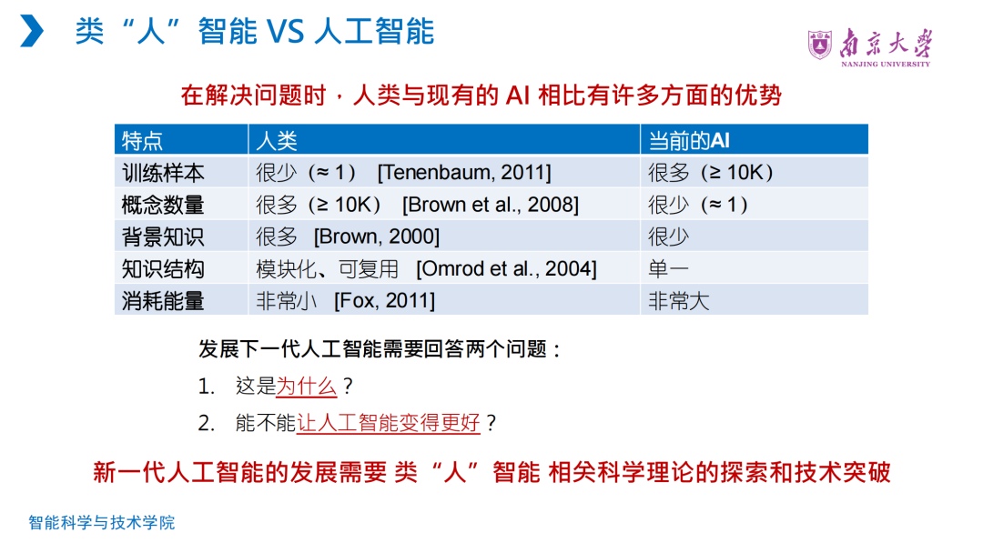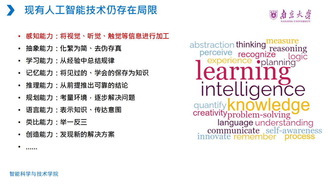 然后,张老师详细地介绍了当前大语言模型技术的成功应用和存在的局限性,并强调新一代人工智能的发展需要探索类“人”智能相关科学理论和技术突破。
